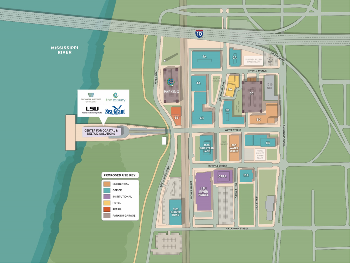 From I-110: Exit I-110 at Government Street.  Take Government Street west towards the river and turn left onto St. Phillip Street.  Continue on St. Phillip to traffic light at South Boulevard.  Turn right onto South Boulevard.  Cross over railroad track and street becomes River Road curving left under the Mississippi River Bridge.  Continue on River Road. As you approach the Center for Coastal and Deltaic Solutions, the parking lot will be on the left side of River Road and the building will be on the right side of River Road.